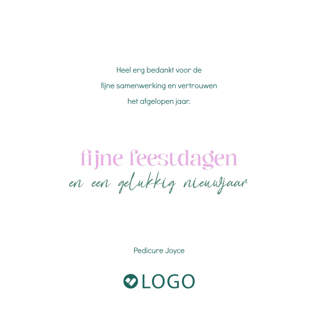 Happy holi toes! Verras je klanten en zakelijke relaties met deze te gekke zakelijke kerstkaart. Deze kerstkaart is zeker geschikt voor een pedicurepraktijk. In de binnenzijde kun je je eigen bedrijfslogo toevoegen. In onze online editor kun je de gehele kaart aanpassen. Met de lichtroze envelopkleur maak je deze leuke holi toes kerstkaart helemaal af. Hulp nodig? Ons team staat voor je klaar.