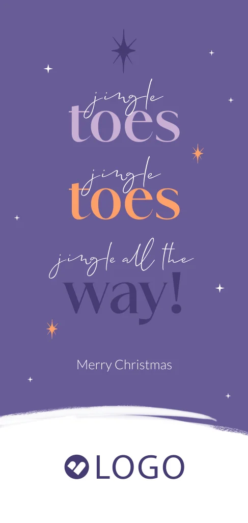 Wens je medewerkers en zakelijke relaties fijne feestdagen toe met deze zakelijke kerstkaart. Op deze kaart staat de tekst 'Jingle toes, jingle toes, jingle all the way!'. Deze zakelijke kerstkaart is zeer geschikt voor een pedicurepraktijk. Voeg je eigen pedicure bedrijfslogo toe voor de persoonlijke touch en pas de rest van deze kerstkaart naar eigen wens aan in onze online editor.