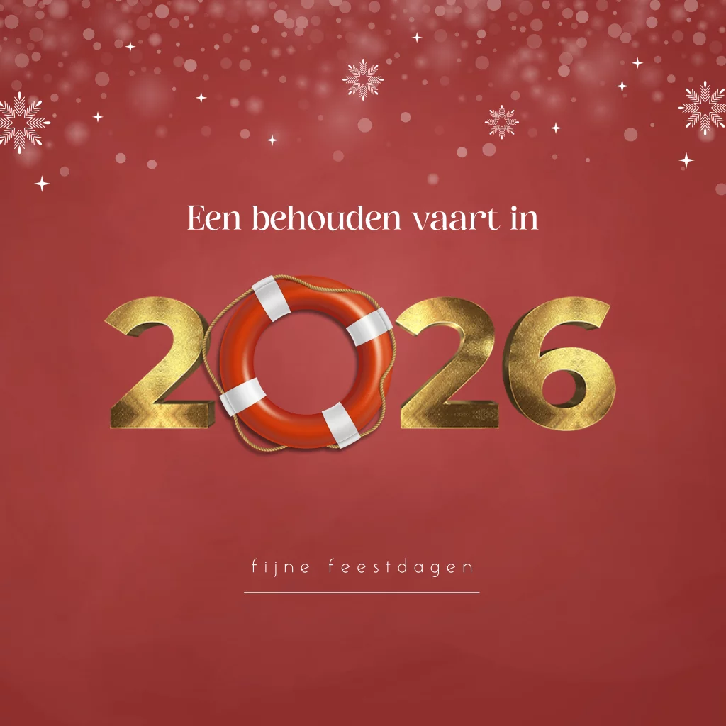 Zakelijke maritiem kerstkaart met de tekst 'een behouden vaart in 2026'. Wens je zakelijke relaties fijne feestdagen met deze maritiem kerstkaart. Aan het jaartal is een reddingsboei toegevoegd waardoor deze kaart geschikt is voor bedrijven die zich richten op de zeevaart, scheepvaart en binnenwateren, zoals schepen, havens, en de bijbehorende techniek en handel.