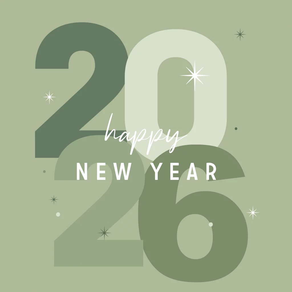 Wens al je zakelijke relaties, medewerkers en klanten fijne feestdagen toe met deze zakelijke kerstkaart. Op deze kaart staat groot het nieuwe jaartal, 2026, in hippe groene kleuren.