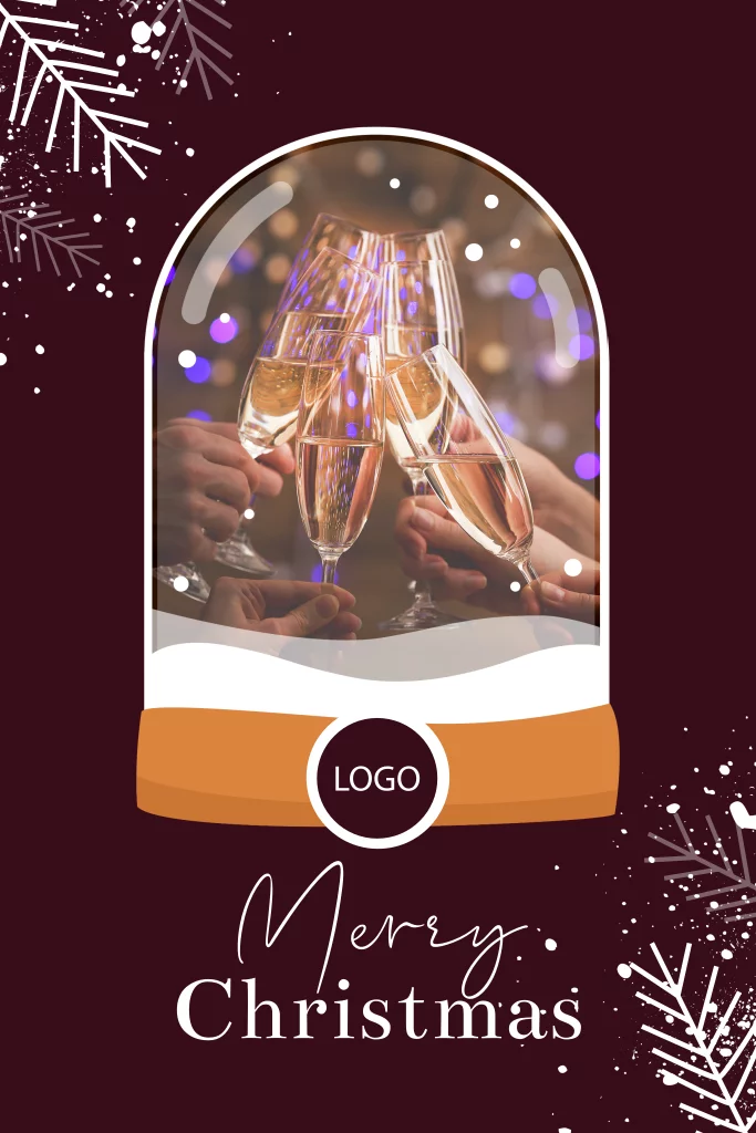 Winterse zakelijke kerstkaart met een sneeuwbol met sfeerfoto met daarop proostende champagneglazen. Wens je klanten fijne feestdagen en bedank ze voor de fijne samenwerking het afgelopen jaar met deze mooie kaart. Op de paarse achtergrond sneeuw met winterse kersttakken. Deze kaart is geschikt voor bedrijven in de horeca. Teksten en kleuren zijn makkelijk aan te passen in onze editor. Opmaakhulp nodig? Wij helpen je graag.