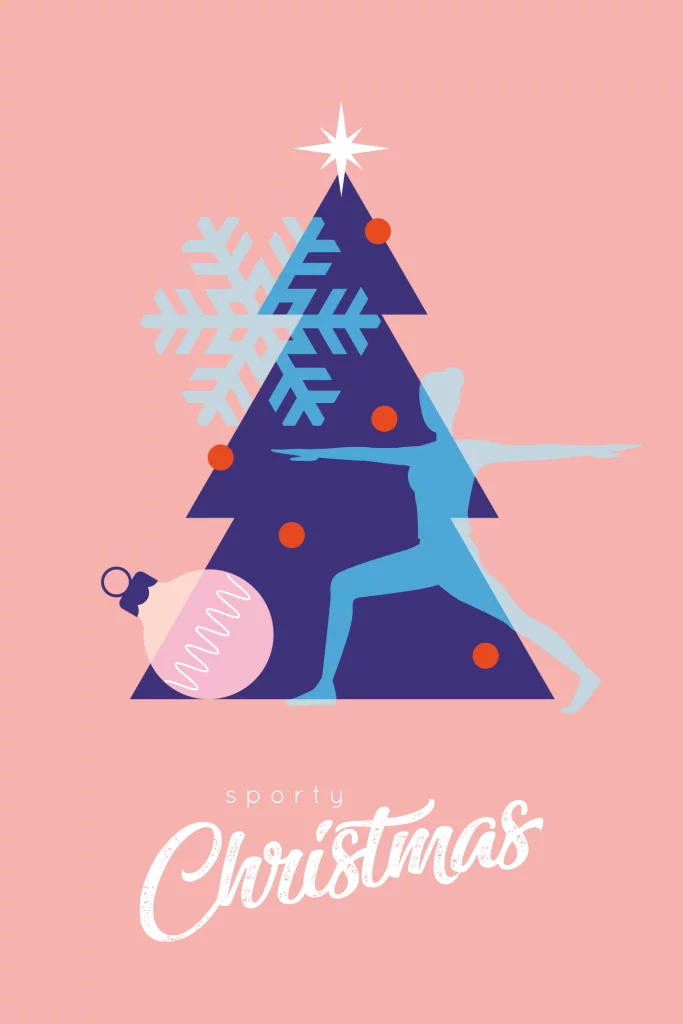 Sportieve zakelijke kerstkaart voor de sport branche. Deze kerstkaart heeft een roze achtergrond met een blauwe kerstboom, kerstbal en sneeuw. Voor de boom zie je een silhouet van een vrouw die aan pilates doet. Pas naar eigen wens aan in de editor.
