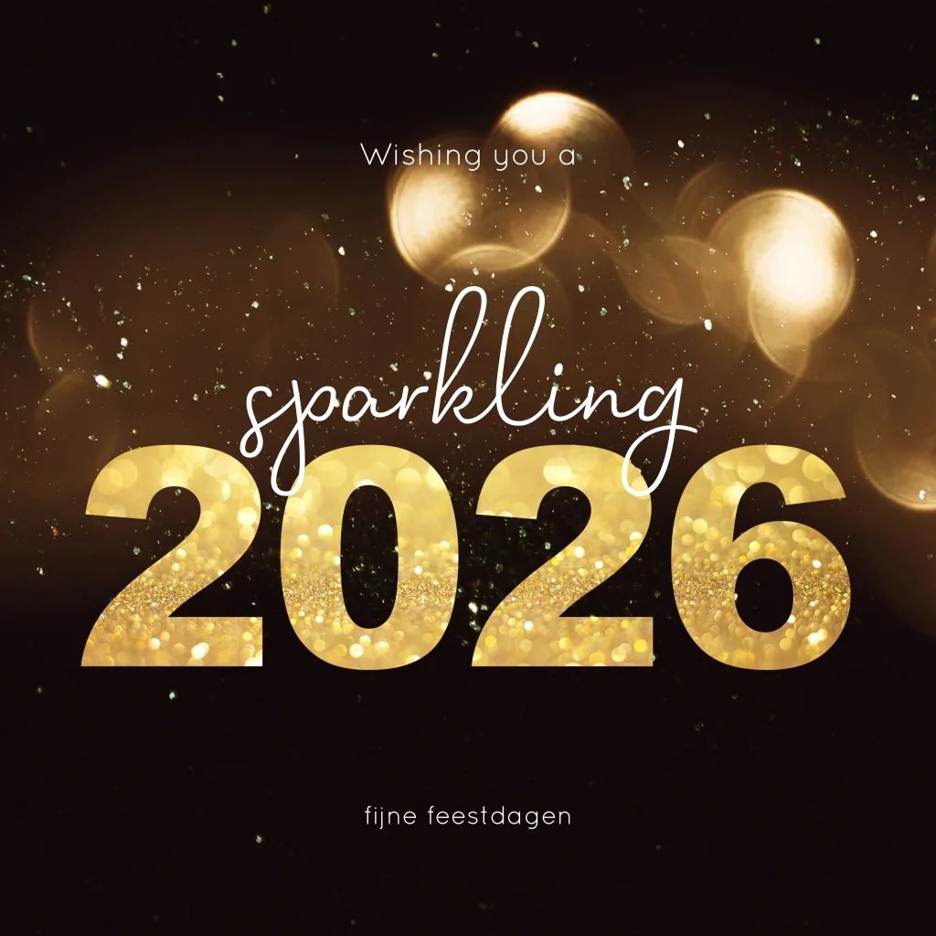 Stijlvolle zakelijke kerstkaart met de tekst "a sparkling 2026". Geschikt voor bedrijven uit diverse sectoren en branches. Op deze kerstkaart het jaartal 2026 centraal in mooie goudkleurige cijfers. De witte spetters en gouden, ronde vormen voor de donkere achtergrond geven een feestelijk effect. Op deze kaart is het mogelijk om op de binnenzijde een eigen bedrijfslogo toe te voegen. Hulp nodig bij het aanpassen van deze kaart? We helpen je graag!