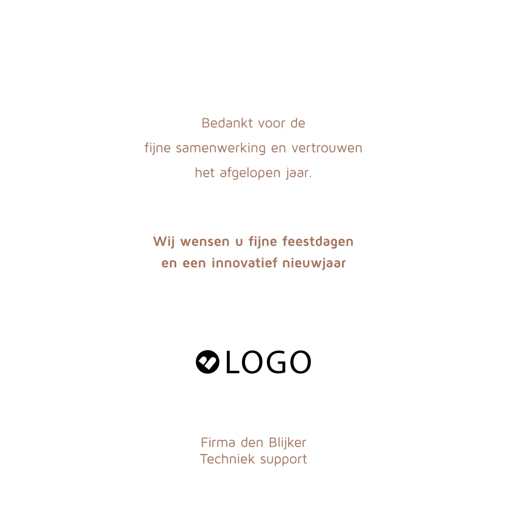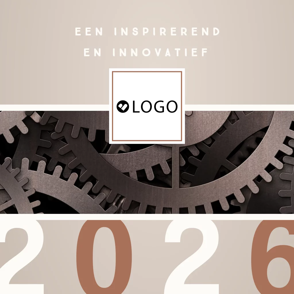 Een inspirerend en innovatief 2026, speciaal voor een bedrijf welke te maken hebben met techniek, industrie, innovatie, processen, e.d. Wens je klanten en zakelijke relaties fijne feestdagen met deze mooie zakelijke kerstkaart. Op deze kaart in beige koper tinten staat een sfeerfoto van verschillende tandwielen. De foto kan vervangen worden door een eigen foto.