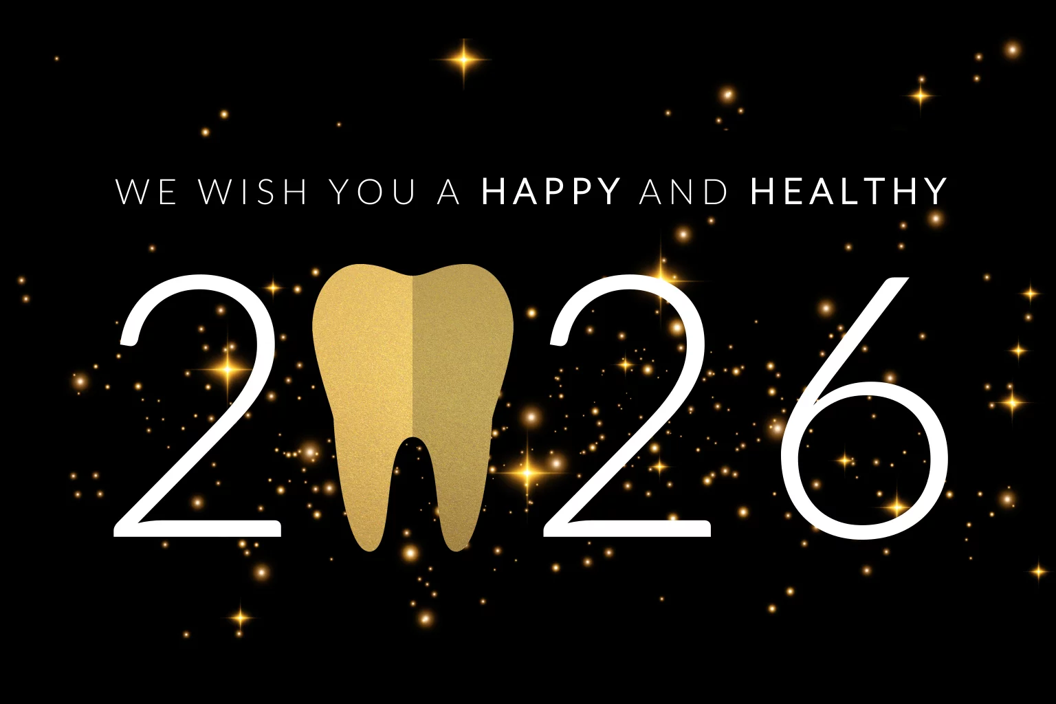 Speciaal ontworpen zakelijke kerstkaart voor bedrijven in de tandzorg zoals een tandarts praktijk. Stuur deze stijlvolle kaart naar je zakelijke relaties en wens ze een gelukkig en gezond 2026. Op de kaart staat een zwarte achtergrond met gouden sprankelende sterren en het jaartal 2026 in witte letters. In het jaartal staat een gouden kies. Op de binnenzijde van de kaart is er ruimte voor jullie eigen bedrijfslogo.