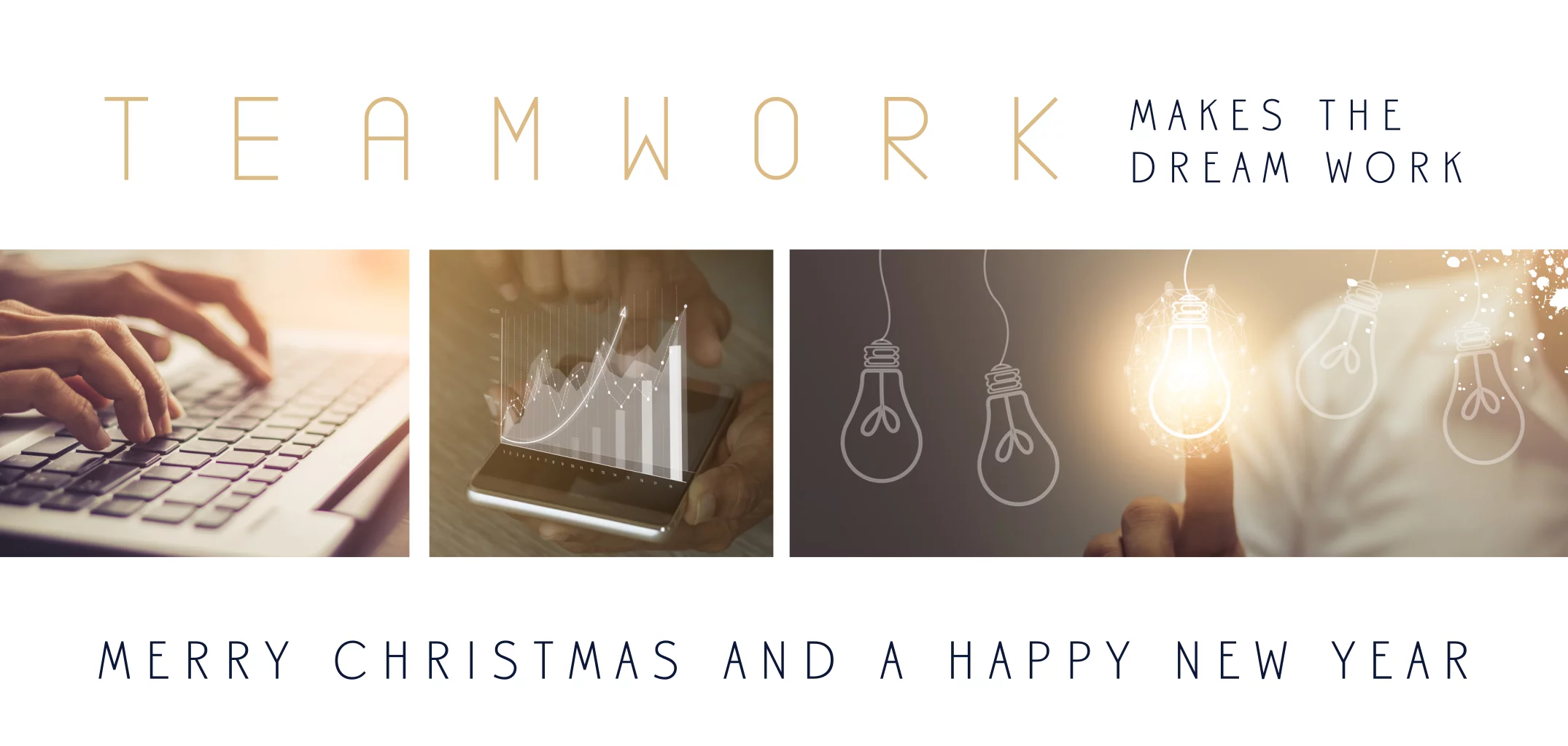 Teamwork makes the dream work! Zakelijke kerstkaart voor bedrijven met sfeervolle foto's van een laptop of computer, een succesvolle grafiek en een brandende lamp welk doelt op inspiratie of een goed idee. Op deze kaart is het mogelijk om op de binnenzijde een eigen bedrijfslogo toe te voegen. Deze kaart is voor alle branches en sectoren geschikt, maar met name ook voor de digitale branche, internationale en zakelijke dienstverlening. De gebruikte foto's zijn ook te vervangen voor eigen bedrijfsfoto's. Hulp nodig bij het aanpassen van deze kaart? We helpen je graag!
