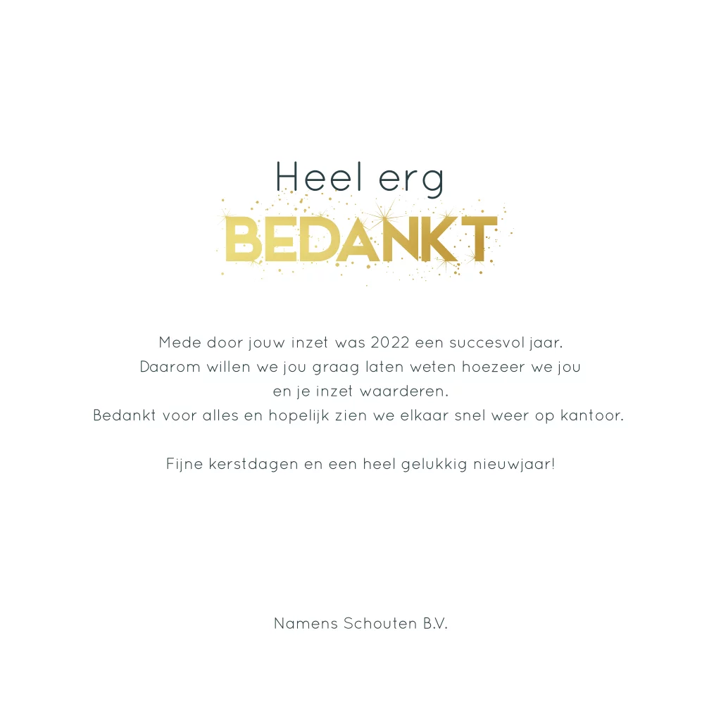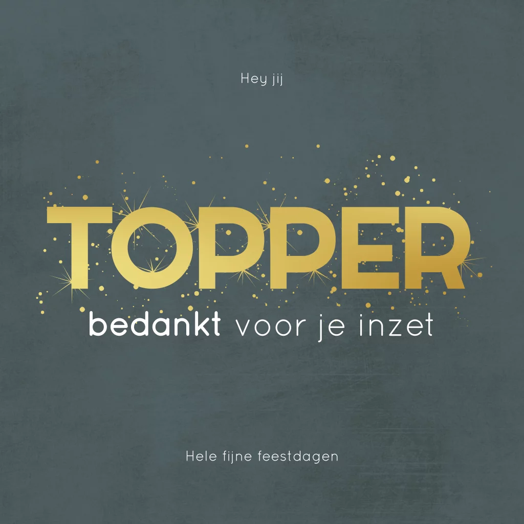 Een zakelijke kerstkaart voor een echte topper! Verras jouw medewerkers met deze toffe kerstkaart met op de voorzijde de opvallende, sprankelende tekst "Topper" in goudkleur, voorzien van stippen en vuurwerk. Deze hippe kaart is voor elke branche of sector geschikt en is qua tekst eenvoudig aan te passen in onze editor. Hulp nodig? Wij helpen je graag verder.