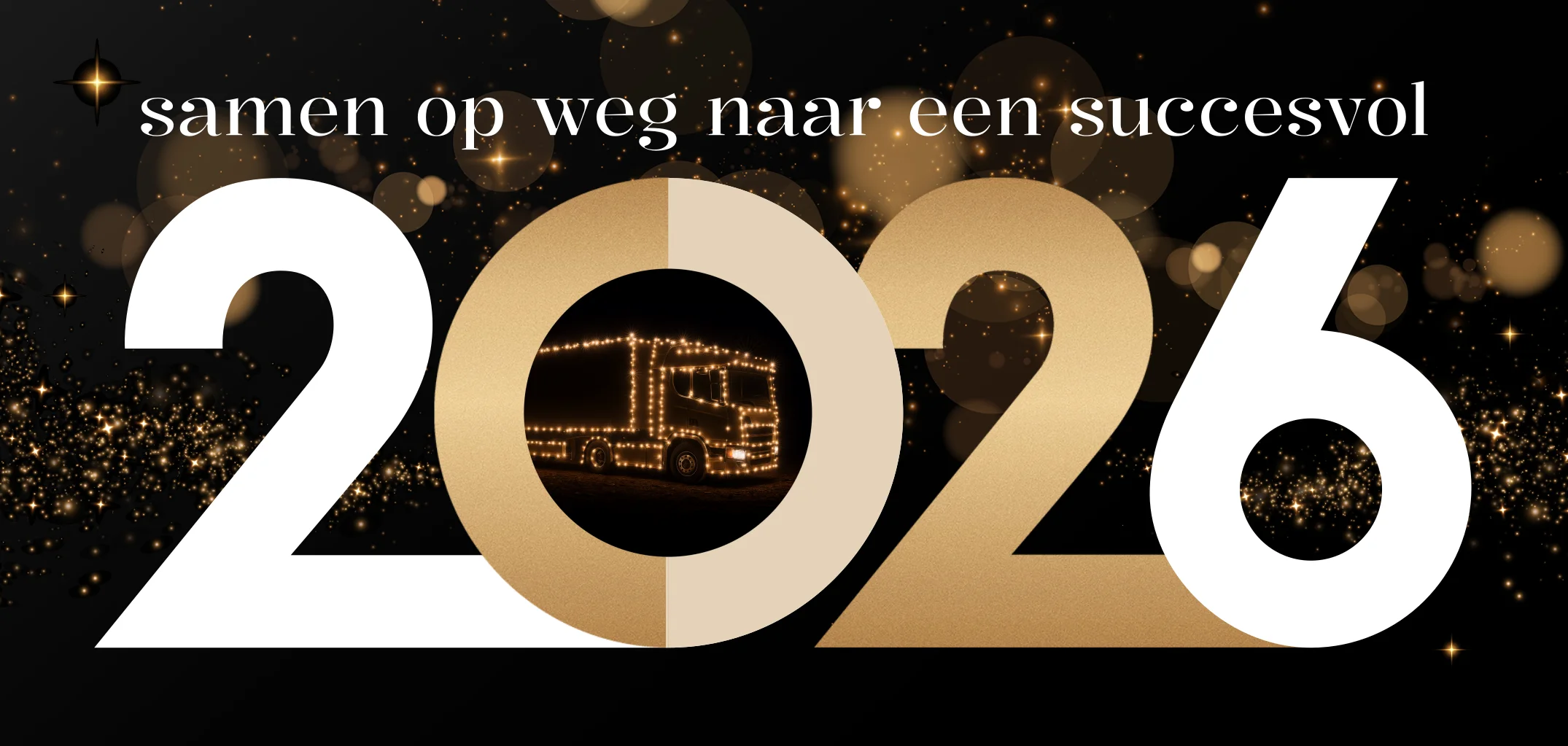 Zakelijke nieuwjaarskaart met goudlook en jaartal 2026. In het jaartal zie je een verlichte vrachtwagen met sprankelende lichtjes. Een perfecte kerstkaart voor bedrijven in de transport of internationale branche. Je zal met deze kerstkaart zeker indruk maken op je klanten en zakenrelaties.