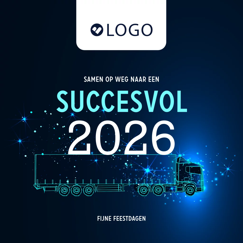 Deze zakelijke kerstkaart met lichtgevende vrachtwagen is speciaal ontworpen voor de transport en logistieke sector. Op de donkerblauwe kaart staat de tekst 'Samen op weg naar een succesvol 2026'. Om de vrachtwagen staan ook nog lichtgevende sterren. Pas deze kerstkaart naar eigen smaak aan in onze online editor of schakel onze gratis opmaakhulp in.
