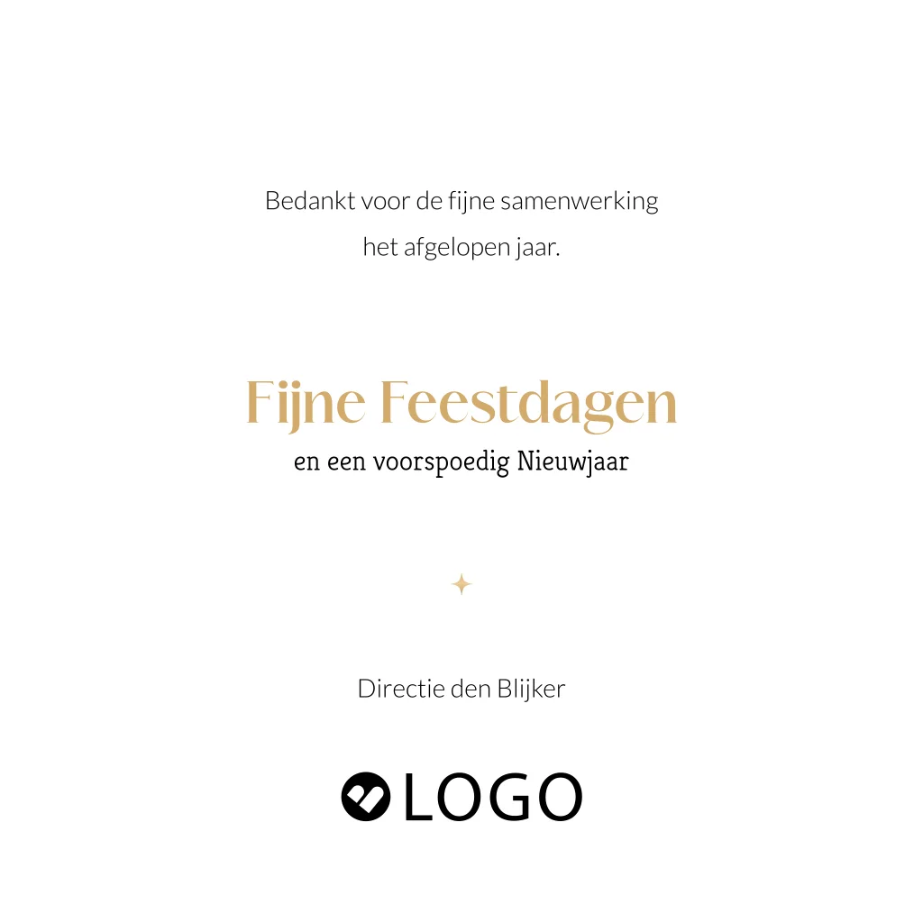 Bedank je zakelijke relaties voor het afgelopen jaar en wens ze fijne feestdagen met deze stijlvolle zakelijke nieuwjaarskaart. De kaart heeft een zwarte achtergrond met vuurwerk in goudlook met mooie sparkles. Een echte feestelijke kerstkaart! Op de binnenzijde is ruimte voor een eigen logo. De afbeelding van het logo dient als voorbeeld en wordt niet gedrukt. Deze kun je verwijderen of plaats hier je eigen logo overheen.
