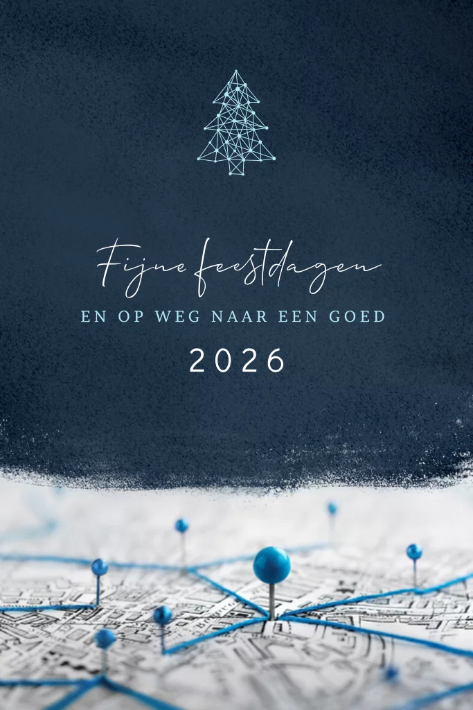 Samen op weg naar een goed 2026! Stuur deze zakelijke kerstkaart met plattegrond van een weg met spelden, naar je klanten, medewerkers en zakelijke relaties en wens ze fijne feestdagen. Geschikt voor bedrijven in de transport en logistiek zoals een transportbedrijf.
