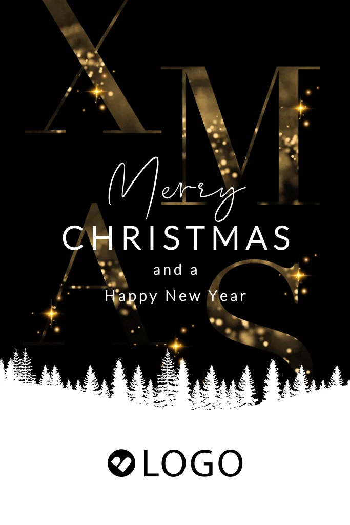 Feestelijke X-Mas kerstkaart zakelijk met sparkles, kerstbomen en logo
