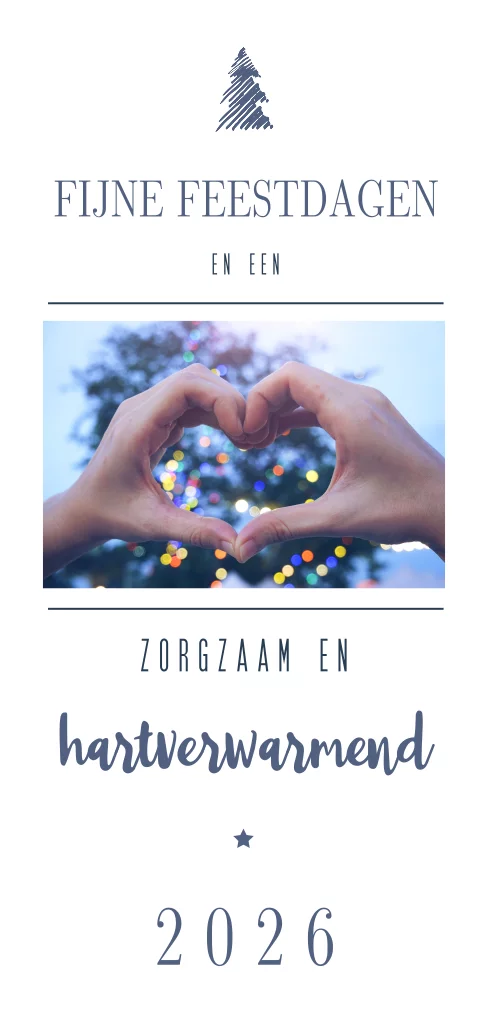 Zakelijke kerstkaart voor een zorg instelling of een zorg gerelateerd bedrijf met ronde hoeken. Op deze zakelijke kerstkaart staat een foto met een hand in hart vorm voor een kerstboom met lichtjes. De tekst zorgzaam en hartverwarmend staan ook op de kaart. Deze kaart kan worden voorzien van een bedrijfs logo.