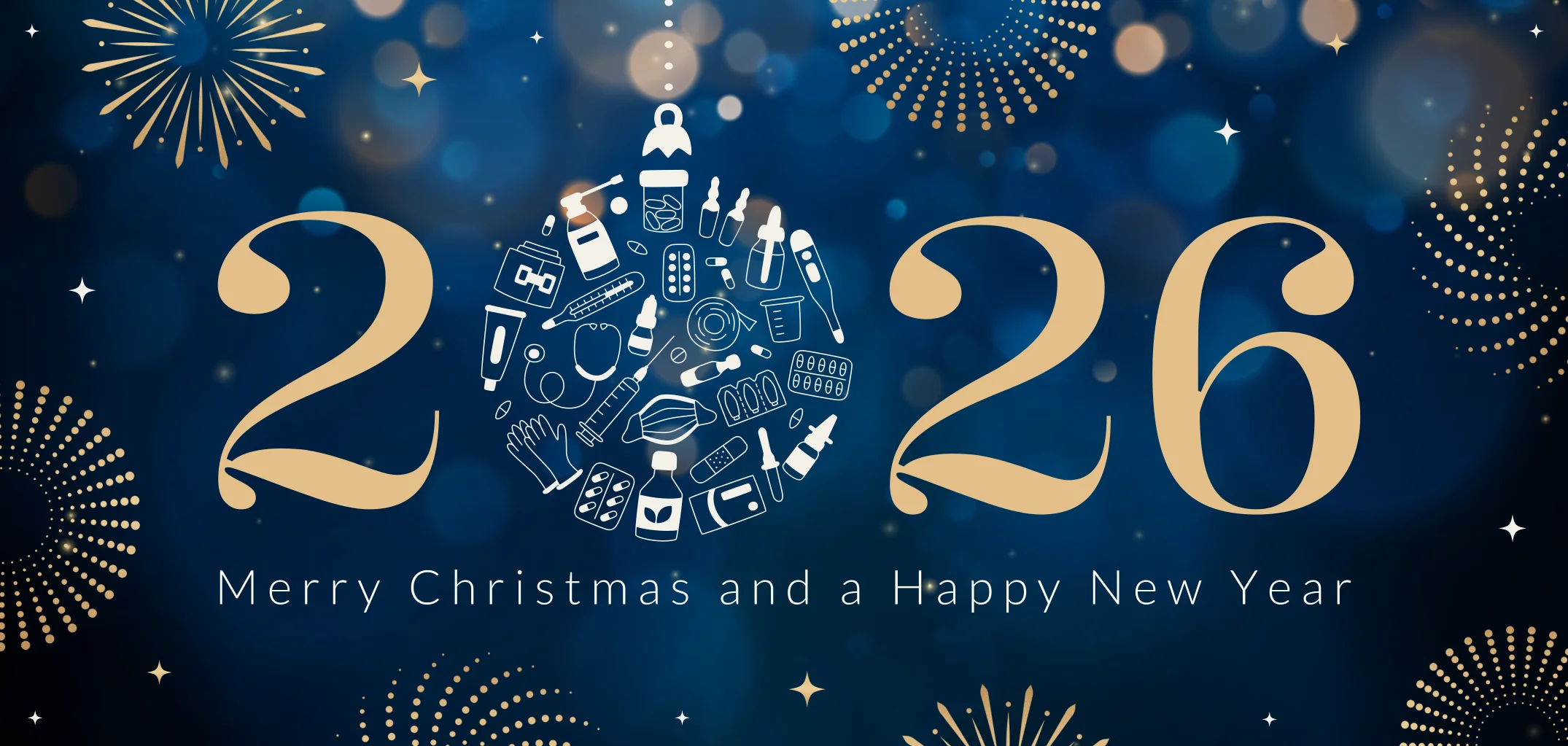 Zakelijke kerstkaart met jaartal en kerstbal met attributen die in de zorg worden gebruikt. Een perfecte kerstkaart voor een zorgorganisatie. De kaart is feestelijk door de donkere achtergrond met gouden accenten en vuurwerk. Extra opvallend is het gouden jaartal 2026 waarvan de nul een kerstbal is. Je zal met deze kerstkaart zeker indruk maken op je klanten en zakenrelaties. Op de binnenkant is ook nog ruimte voor je eigen logo.