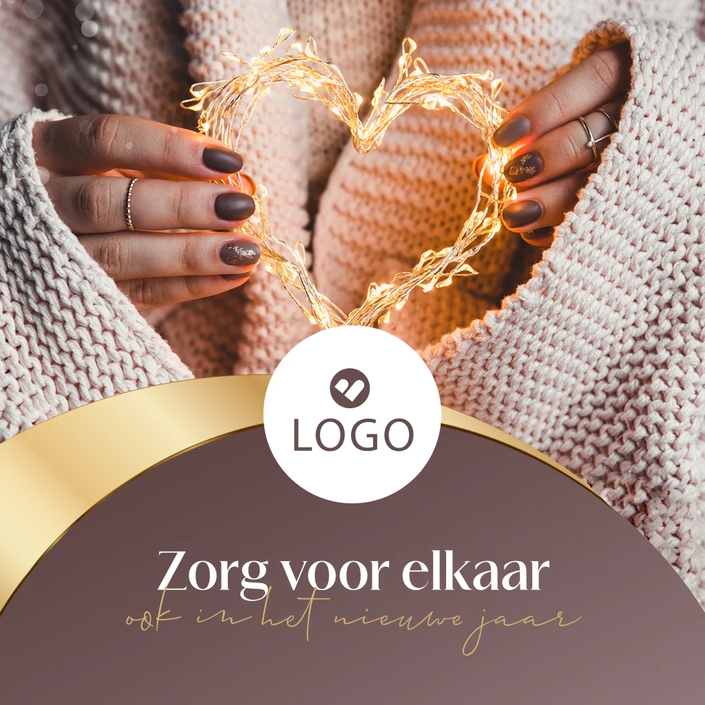 Een mooie zakelijke kerstkaart met de tekst "Zorg voor elkaar, ook in het nieuwe jaar". Deze kaart is geschikt voor de zorg branche. Op deze kerstkaart zie je een foto van een verlicht hartje. Deze foto kun je eventueel naar een eigen bedrijfsfoto aanpassen. Verder kun je voor de persoonlijke touch een eigen bedrijfslogo op de voorkant toevoegen. Hulp nodig bij het aanpassen van deze kaart? We helpen je graag!