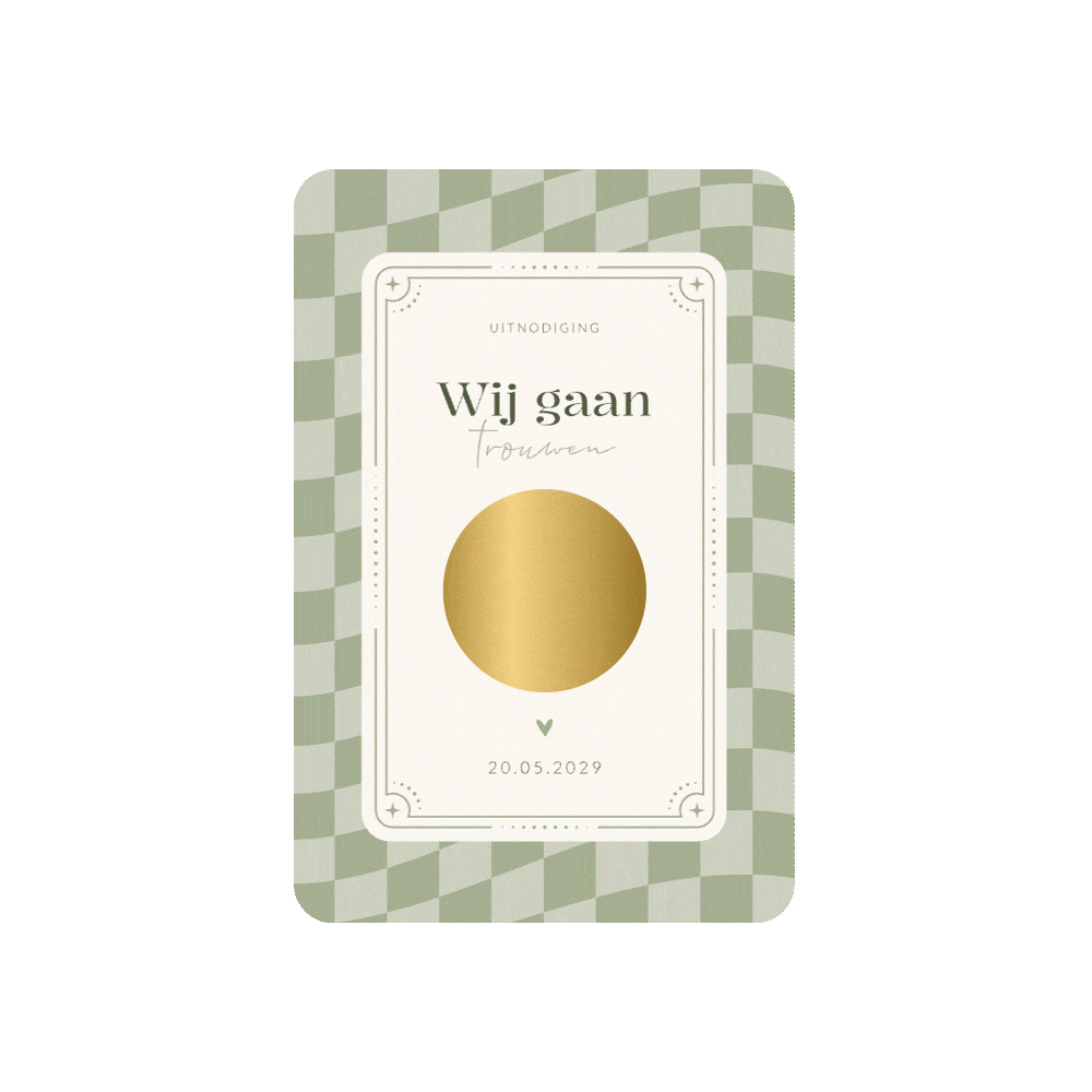 Originele trouwkaart met krassticker. Deze kraskaart trouwkaart zal zeker opvallen bij je gasten door de toevoeging van de krassticker. De huwelijksuitnodiging heeft een hip ontwerp met een groen geblokt patroon met daarvoor een kader met tekst. Achter de krassticker staan jullie namen.