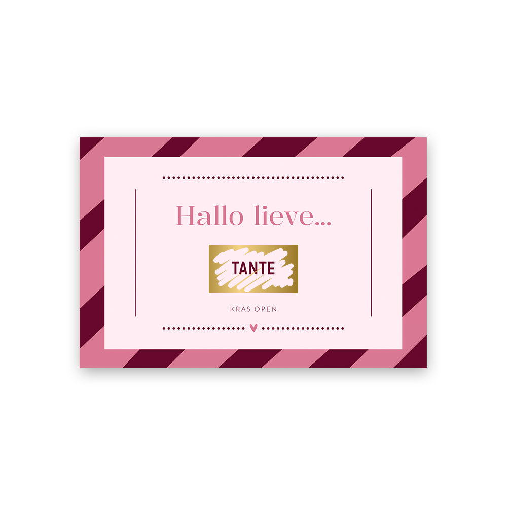 Wordt je zus tante? Laat haar dit weten met deze originele kraskaart! De kraskaart heeft een vrolijk en hip design met een roze streep patroon. In het rechthoekige kader kun je de krassticker plakken.