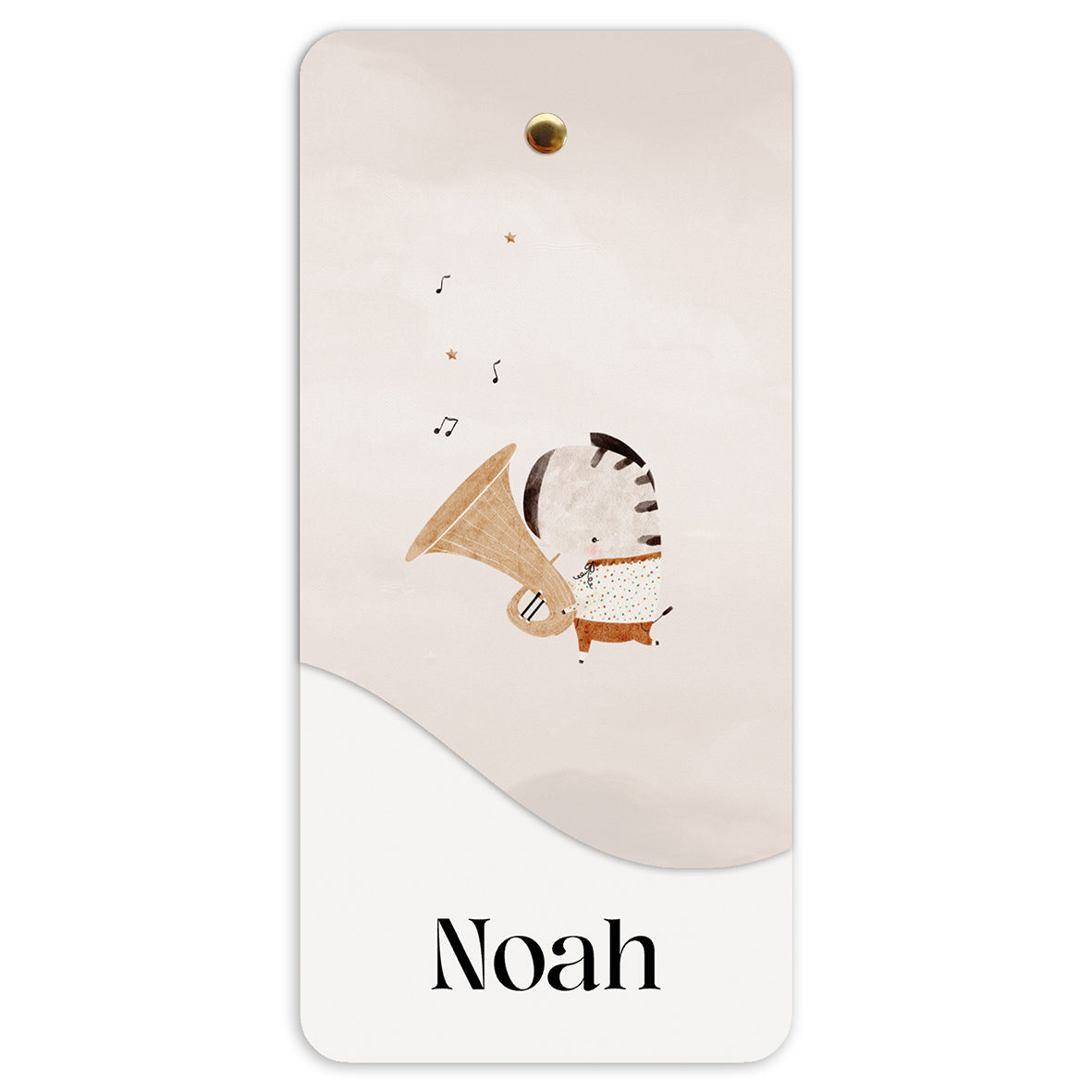 Een uniek geboortekaartje voor je zoon! Dit geboortekaartje Noah heeft een mooie zachte neutrale kleuren en is uniek doordat deze uit twee kaartjes bestaat, een hoofdkaart en extra labelkaartje. Op de hoofdkaart staat de babynaam en de geboortegegevens. Op het labeltje staat een lief zebraatje die een trombone bespeelt. Op de achtergrond kleine muzieknoten.