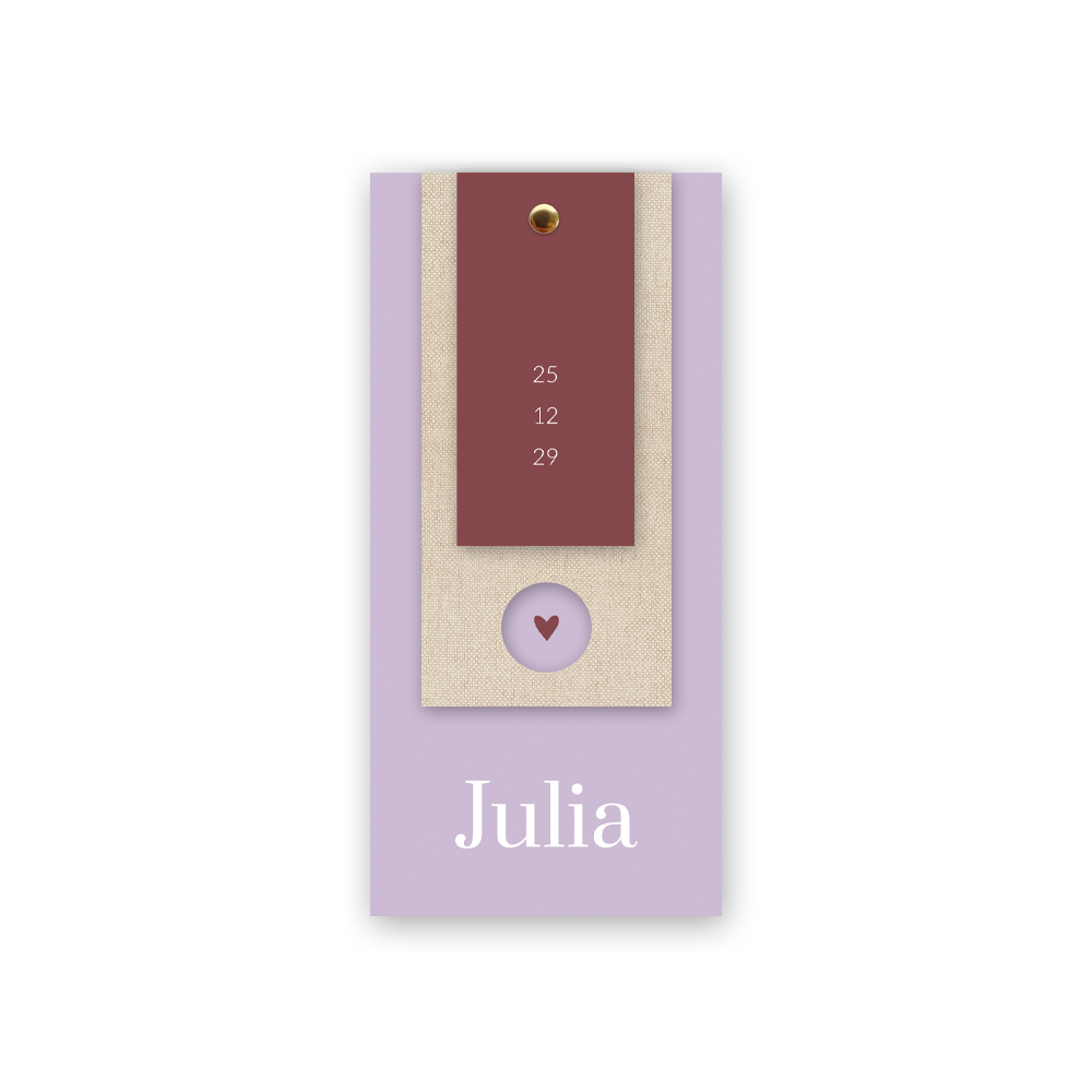 Rustig label geboortekaartje om de geboorte van je dochter mee aan te kondigen. Dit geboortekaartje Julia is voorzien van een lila hoofdkaart met twee labeltjes, een metallic gouden label met verfvegen en een licht terracotta label met geboortedatum. De ronde uitsnede geeft een doorkijkje naar een hartje.