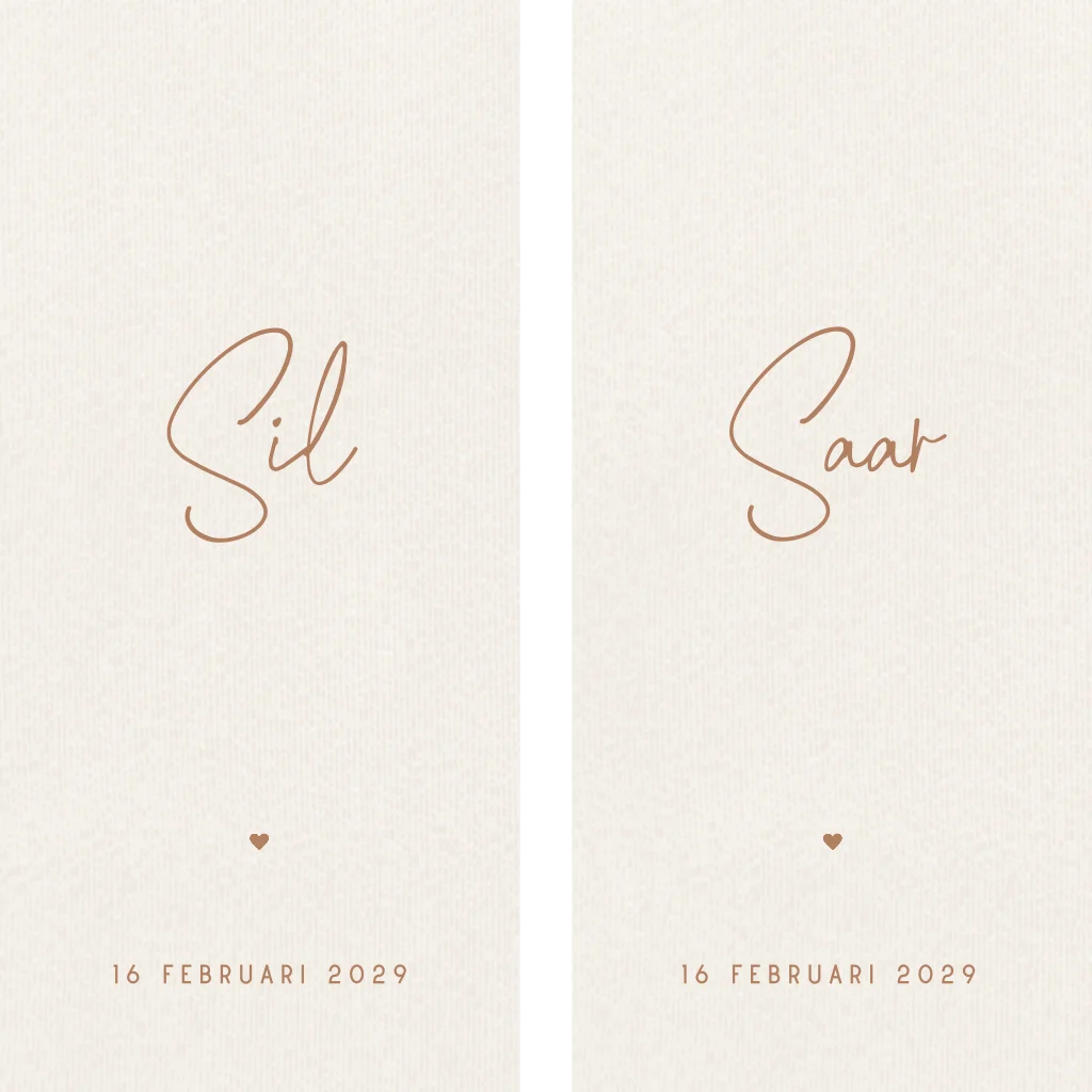 Twee losse tweeling geboortekaartjes die samen ook 1 geheel vormen. Deze rustige tweeling kaartjes hebben een beige achtergrond met daarom de namen Sil en Saar en sierlijk lettertype. Deze combinatiekaarten zijn perfect te gebruiken voor zowel jongens als meisjes tweeling.