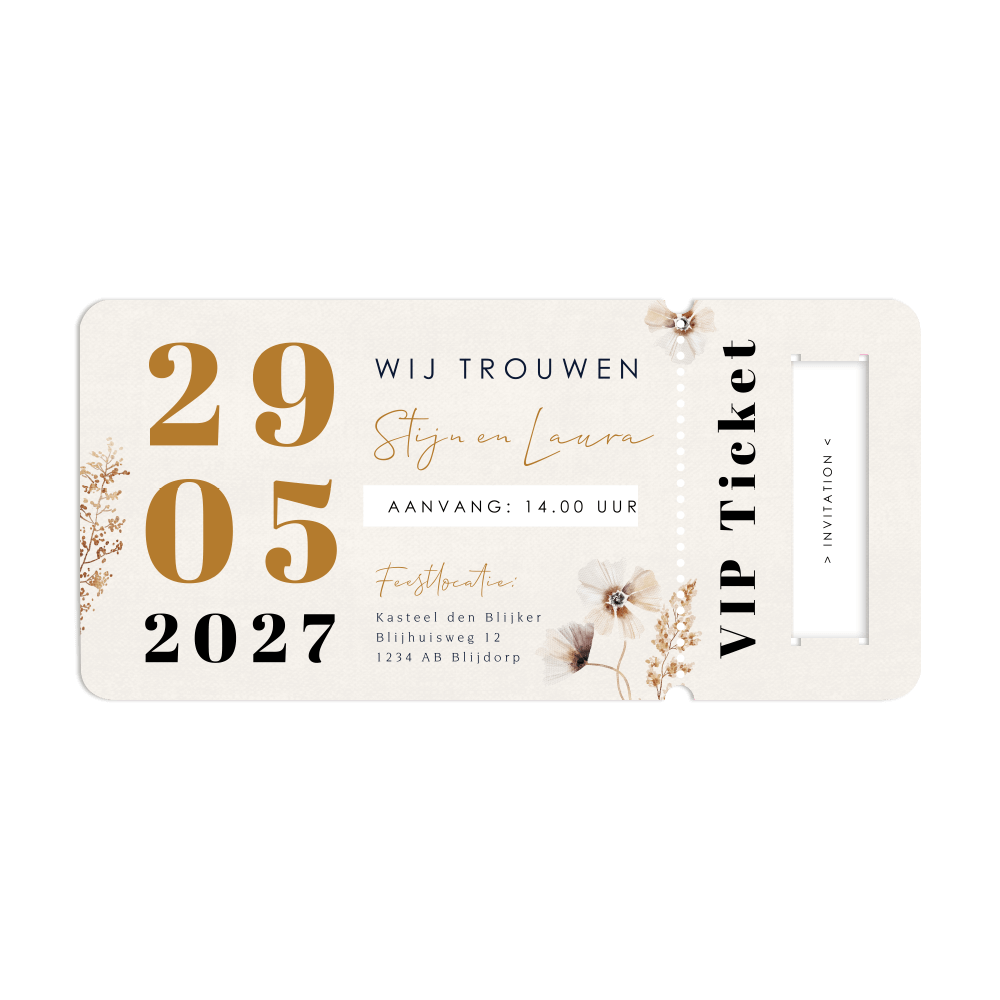 Wanneer je op zoek bent naar een unieke en originele uitnodiging voor je bruiloft, dan is deze trouwkaart in ticketstijl echt iets voor jou. Nodig je gasten als echte VIP's uit voor jullie bruiloft. Deze huwelijksuitnodiging heeft een beige zandkleur met prachtige droogbloemen. Je kunt de kaart geheel naar eigen wens aanpassen in de editor. Kom je er niet uit? We helpen je graag!