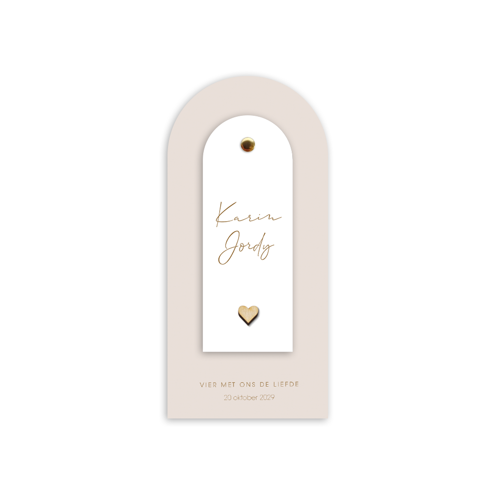 Labelkaart met een echt houten hartje. Deze huwelijksuitnodiging heeft een basic design maar door de boogvorm en het houten hartje is deze kaart helemaal exclusief. Teksten en kleuren zijn makkelijk aan te passen in onze editor.