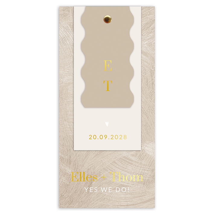 Prachtige label trouwkaart om jullie trouwdag mee aan te kondigen aan vrienden en familie. Deze huwelijksuitnodiging is voorzien van langwerpige hoofdkaart met labeltjes. De trouwkaart heeft een luxe uitstraling met een brons gouden achtergrond met vegen. Het lijkt wel een luxe behang! De labeltjes hebben een strakke en organische vorm van golven. Dit geeft een speels effect aan deze luxe label trouwkaart. De foliedruk maakt het helemaal af!