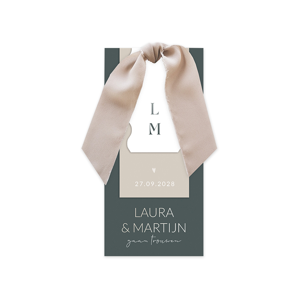 Label trouwkaart met initialen, hoogglans en lintje van zijde