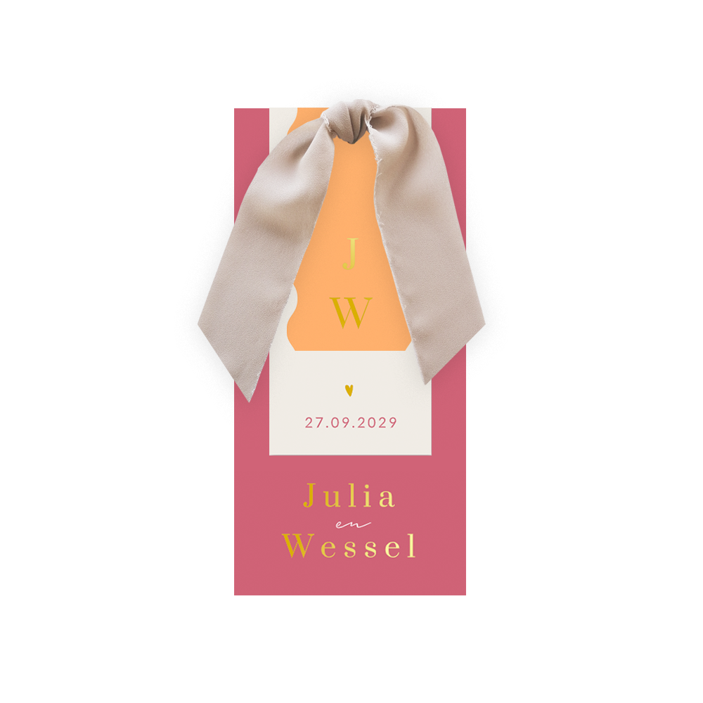 Originele trouwkaart met labels en felle kleuren. Deze labelkaart huwelijksuitnodiging is lekker vrolijk met een luxe tintje door de aparte vormen, dubbelzijdige foliedruk en zijden chiffon strikje. Met deze huwelijksuitnodiging heb je echt iets anders en dit zal je gasten daarom ook zeker verrassen!