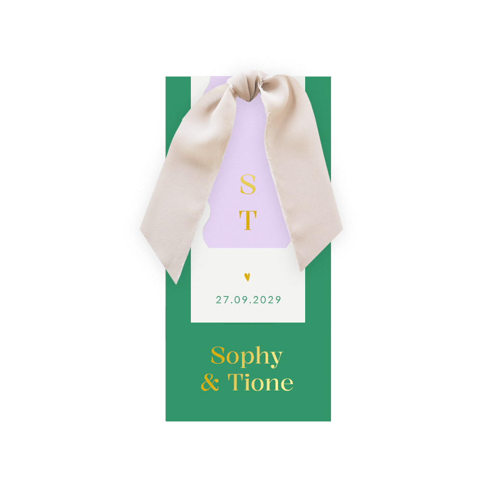 Kleurrijke en vrolijke trouwkaart met labels, foliedruk en echt zijden chiffon strik, een trouwkaart van alle luxe voorzien! De labels hebben verschillende kleuren, groen, wit en lila paars. Op het kleine labeltje staan jullie initialen in goudfolie. Met deze huwelijksuitnodiging heb je echt iets anders en dit zal je gasten daarom ook zeker verrassen!