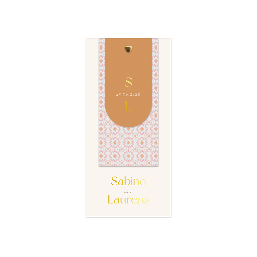 Unieke trouwkaart met prachtige labels. Deze label trouwkaart is een mooie manier om jullie trouwdag aan te kondigen. Met een prachtig roze boho patroon en zachte kleuren past deze trouwuitnodiging perfect in een mediterraanse bruiloft.