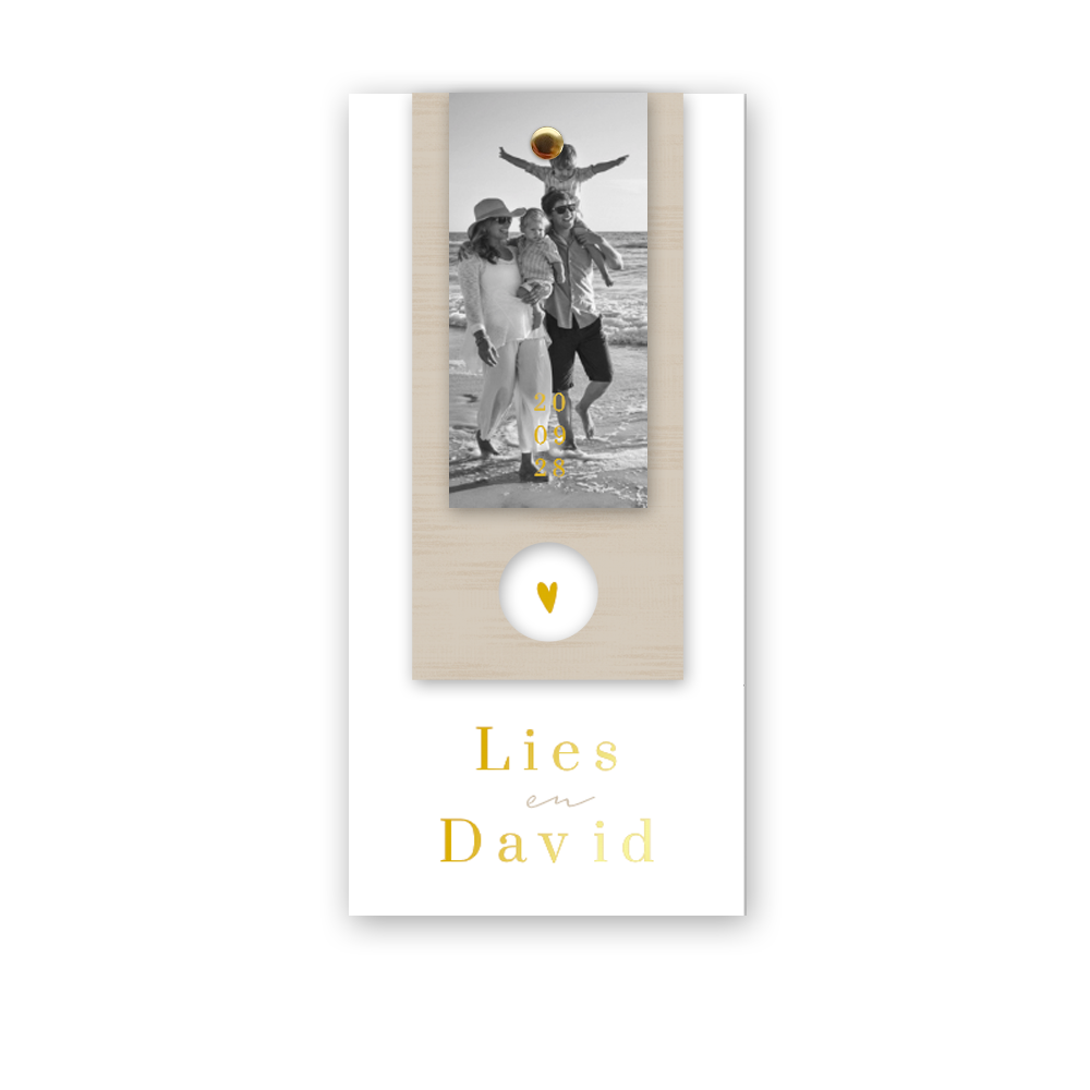 Papa en mama gaan trouwen trouwkaart met labels en gouden foliedruk. Deze trouwkaart is van alle luxe voorzien en zal zeker opvallen bij jullie gasten! De huwelijksuitnodiging heeft een rustige uitstraling door de neutrale witte en zand kleuren. Plaats een foto van jullie als stralend gezin op het voorste labeltje. Zo maak je de uitnodiging extra persoonlijk! De uitsnede geeft een doorkijkje naar een gouden hartje.