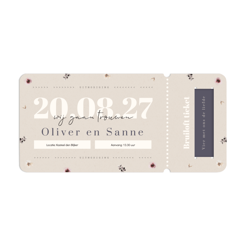 Unieke insteek trouwkaart in ticket stijl. Nodig je gasten uit voor jullie bruiloft met deze originele bruiloft ticket. Deze huwelijksuitnodiging heeft een kartonlook met prachtige gekleurde droogbloemen. Helemaal perfect voor een romantische bruiloft.