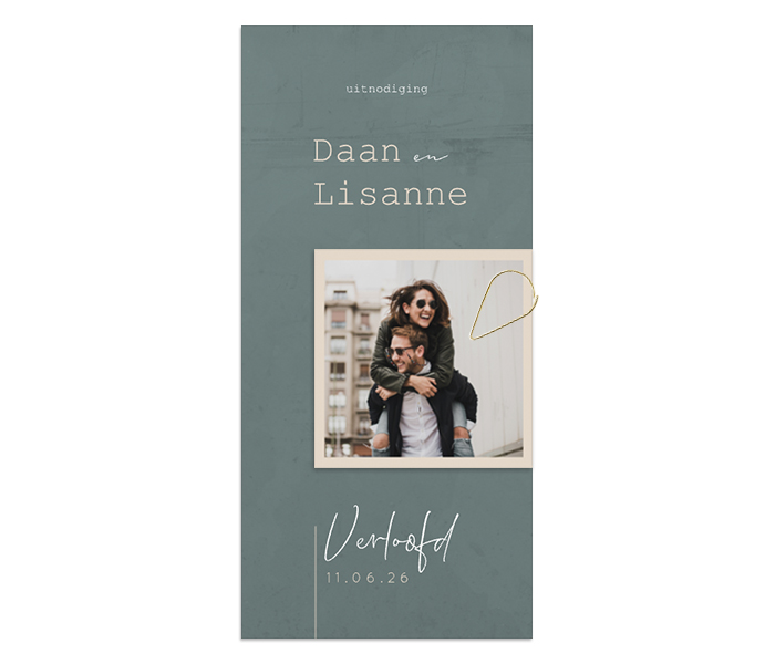Een mooie kaart om jullie verloving aan te kondigen in een trendy groene kleur. Een rustig en strak design waar jullie namen mooi naar voren komen. Voeg jullie persoonlijke foto toe en maak het kaartje compleet. Teksten en kleuren van deze hippe uitnodiging, of kaart ter kennisgeving, zijn makkelijk aan te passen in onze editor.
