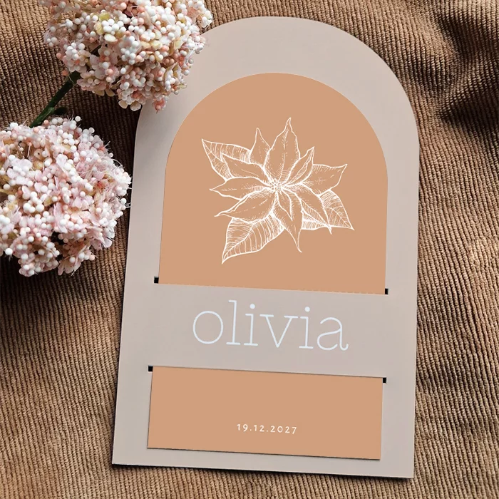 Dit unieke geboortekaartje is perfect voor een meisje. Dit kaartje Olivia is vormgegeven in een boogvorm met een tekening van een kerstster. Deze geboortebloem past bij de maand december. Het geboortekaartje heeft rustige neutrale kleuren. De vorm en insteekkaartjes met unieke geboortebloem maakt het kaartje bijzonder en uniek.