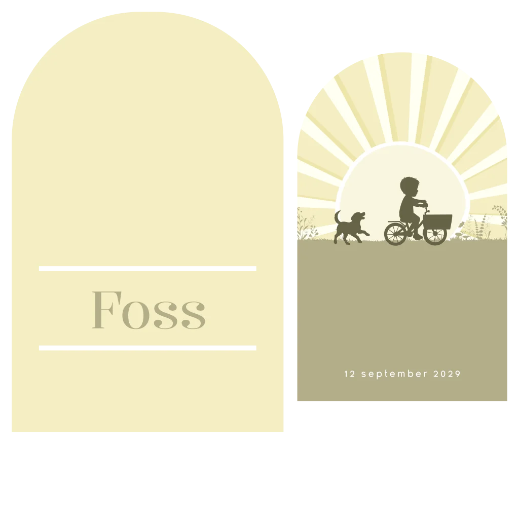 Op zoek naar een uniek geboortekaartje voor jullie kleine wonder? Dit vrolijke geboortekaartje Foss met insteek is perfect! Op het kaartje zie je een zon met zonnestralen en een silhouet van een jongen op de fiets met een hondje. Het kaartje heeft een vrolijke botergele kleur met pistache groen. Helemaal volgens de laatste kleurtrend! Pas dit silhouet geboortekaartje eenvoudig aan in de editor. Dit kaartje is ook mogelijk in een andere gezinssamenstelling of huisdier. Pas dit eenvoudig aan in de editor. Hulp nodig? Wij helpen je graag! Bel, mail of chat ons gerust.