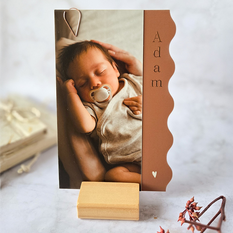 De bruine kaart heeft een originele vorm, namelijk een uitsnede van golven. Dit geeft een speels effect. Op het voorste langwerpige kaartje kun je een mooie foto van jullie pasgeboren zoon zetten. De roségouden foliedruk maakt dit geboortekaartje Adam helemaal af.
