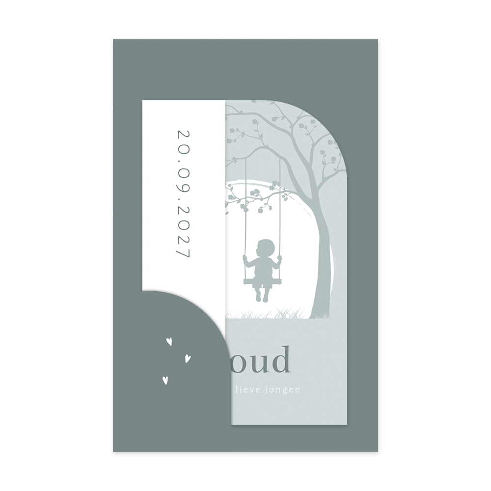 Op dit kaartje Noud een antraciet blauwe hoofdkaart met lichtblauw insteekkaartje. Deze insteekkaart heeft een halve afgeronde hoek wat een speels effect geeft. Op dit kaartje een silhouet van een jongetje op een schommel aan een boom. Op het witte verticale insteekkaartje kun je de geboortedatum van jullie zoon zetten.