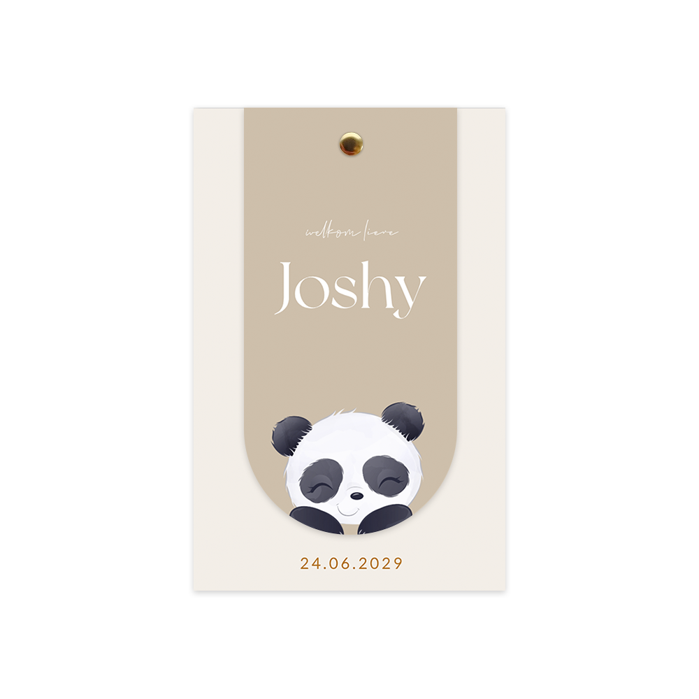 Hippe unisex labelkaart voor een jongen of meisje. Dit geboortekaartje Joshy bestaat uit een rechthoekige beige kaart met een boogvormige kaartje met een illustratie van een schattig pandabeertje.