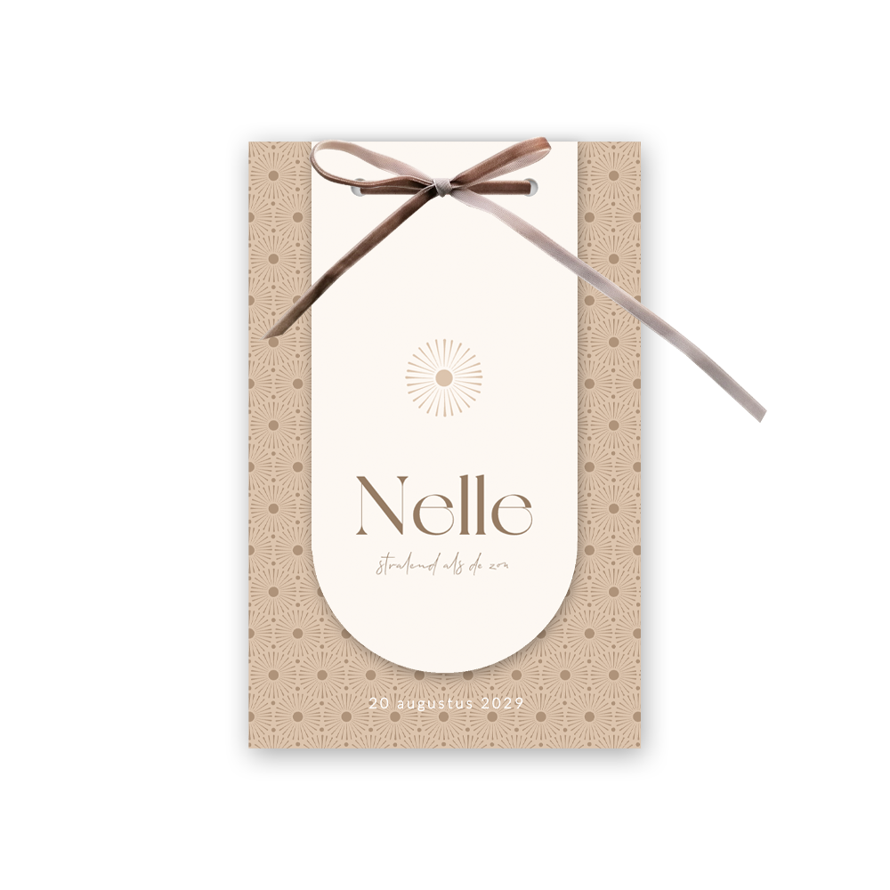 Originele labelkaart met fluwelen lint. Dit geboortekaartje heeft een unisex ontwerp en is daardoor geschikt voor zowel een jongen als een meisje. Dit geboortekaartje Nelle bestaat uit een rechthoekige kaart met een patroon van zonnetjes met daarvoor een boogvormig kaartje. De kaartjes worden aan elkaar bevestigd met een taupe kleurig fluwelen strik.