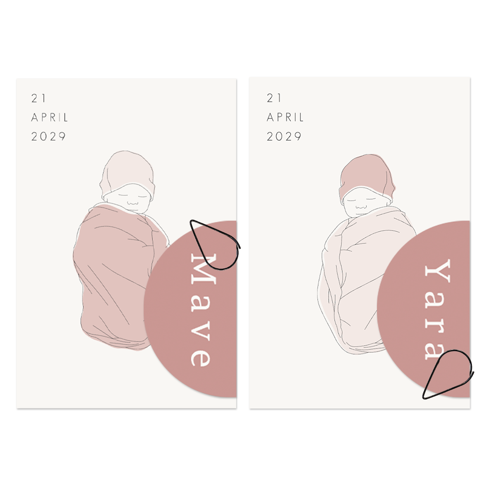 Een rustig geboortekaartje voor jullie meisjes. Extra leuk aan deze labelkaarten Mave en Yara is dat jullie dochters beiden hun eigen geboortekaartje hebben. Op de tweeling geboortekaartjes staat twee keer een mooie lijntekening van een meisje. Zet op het labeltje de namen van jullie tweeling. Deze bevestig je aan elkaar met een druppelvormige paperclip, of een van onze andere hippe paperclip vormen. Teksten, kleuren en lettertypes pas je eenvoudig aan in onze editor. De paperclip bestel je er apart bij.