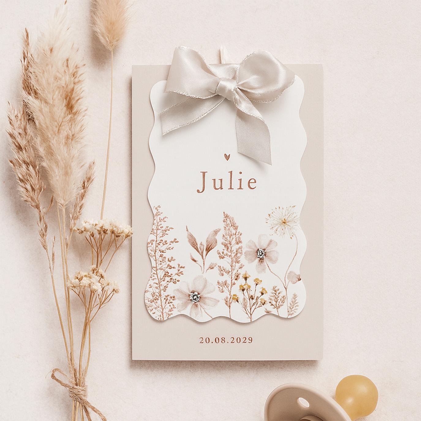 Prachtige labelkaart met zijden chiffon strik. Dit geboortekaartje voor een meisje is origineel en heeft een romantische uitstraling door de bloemen. De strik geeft een klassieke touch.| Totaalprijs: 0 |