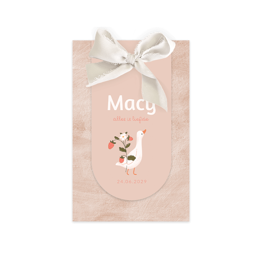 Lief labelkaartje voor de geboorte van een meisje. Dit geboortekaartje Macy bestaat uit een rechthoekige roze kaart met structuurlook. Aan de kaart bevestig je met een zijden lint het boogvormige kaartje met een schattig gansje met aardbeien.