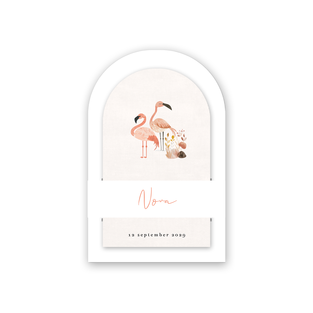Rustig insteek geboortekaartje voor een meisje. Dit geboortekaartje Nova bestaat uit twee kaartjes, een witte hoofdkaart met een beige ingestoken kaart. Beide kaarten hebben een boogvorm. Dit geeft een speels effect aan dit rustige geboortekaartje. Op het ingestoken kaartje zie je een illustratie van een flamingo.