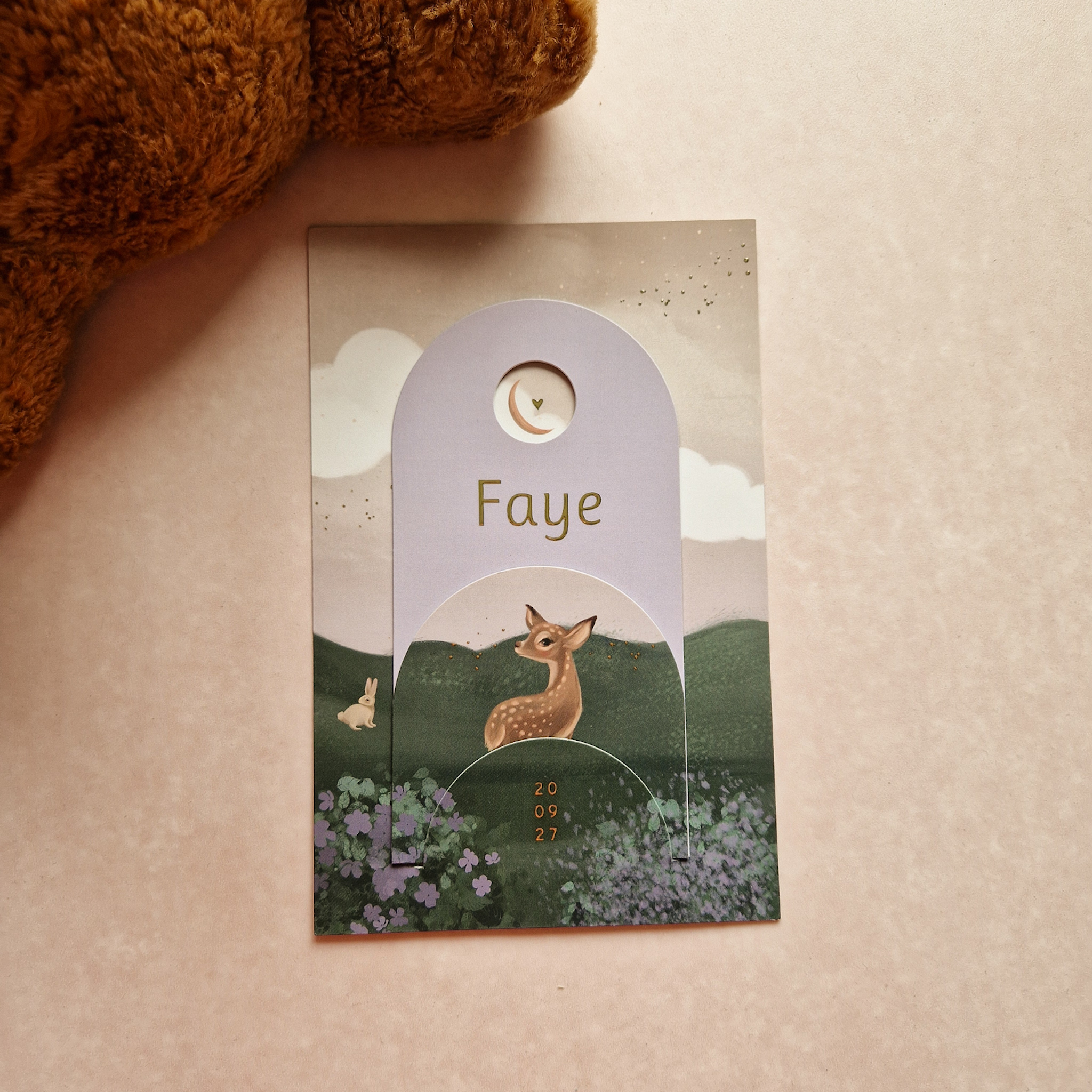Op dit kaartje Faye een hoofdkaart met een sprookjesachtig landschap met groene heuvels en een zacht roze lucht met maan en gouden sterren. Het eerste insteekkaartje met de babynaam van jullie dochter heeft een mooie lila kleur en is in boogvorm. Extra bijzonder hieraan is ook nog dat het een ronde uitsnede heeft wat een doorkijkje geeft naar de hoofdkaart. Op het kleine kaartje een lief hertje.