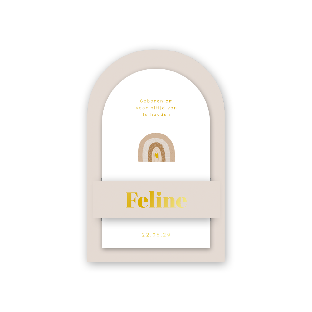 Geboortekaartje voor een meisje met insteek, foliedruk en een regenboog in nude kleuren. Dit meisjeskaartje Feline bestaat uit twee kaartjes, een roze/beige hoofdkaart met een wit ingestoken kaart. Beide kaarten hebben een boogvorm. Dit geeft een speels effect aan dit rustige geboortekaartje. De gouden foliedruk maakt de kaart helemaal af.
