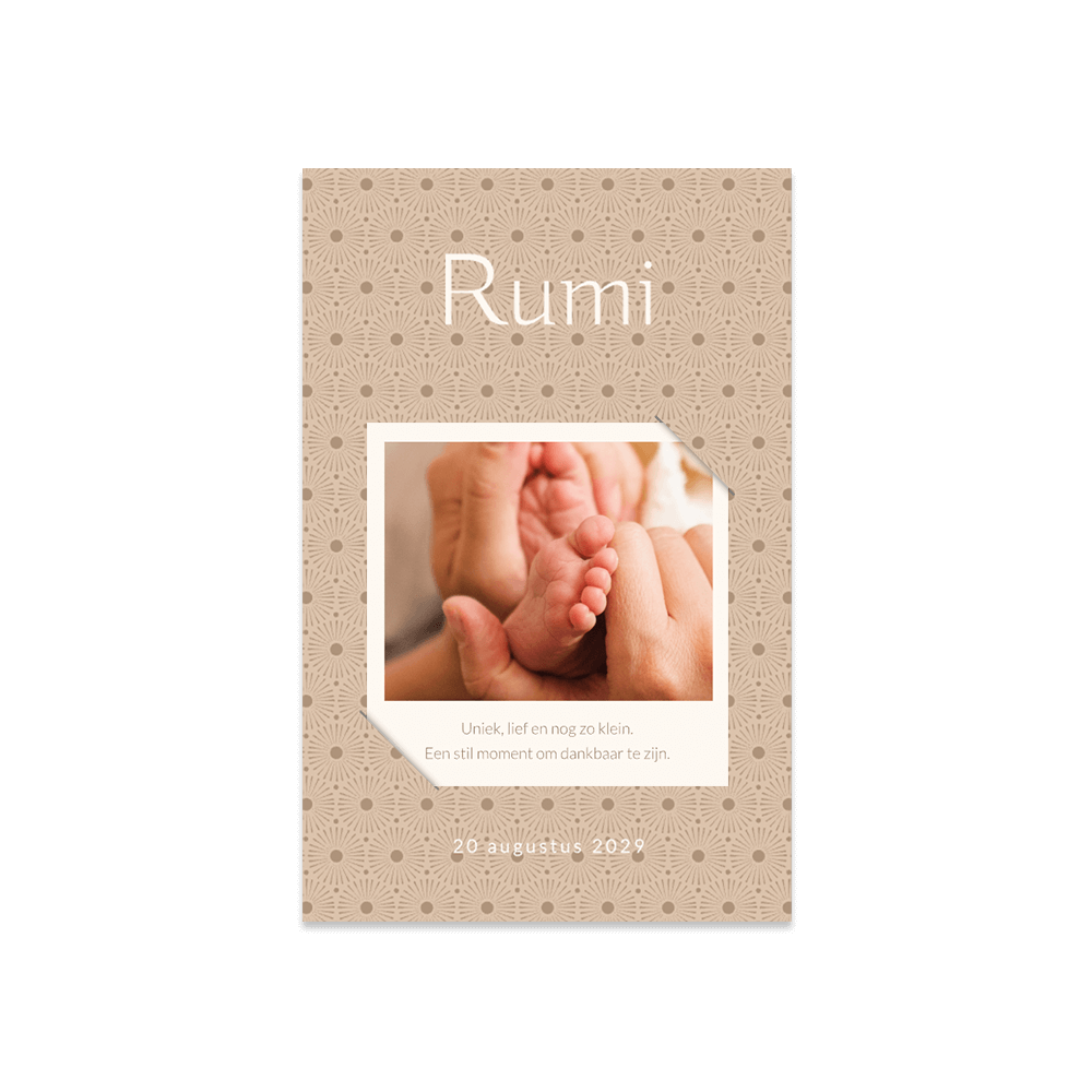 Origineel geboortekaartje voor een meisje. Dit geboortekaartje Rumi bestaat uit een hoofdkaart met een zonnetjes patroon en een labeltje die je erin kunt steken. Het labeltje lijkt op een polaroidfoto, zet hier een mooie foto in van jullie dochter.