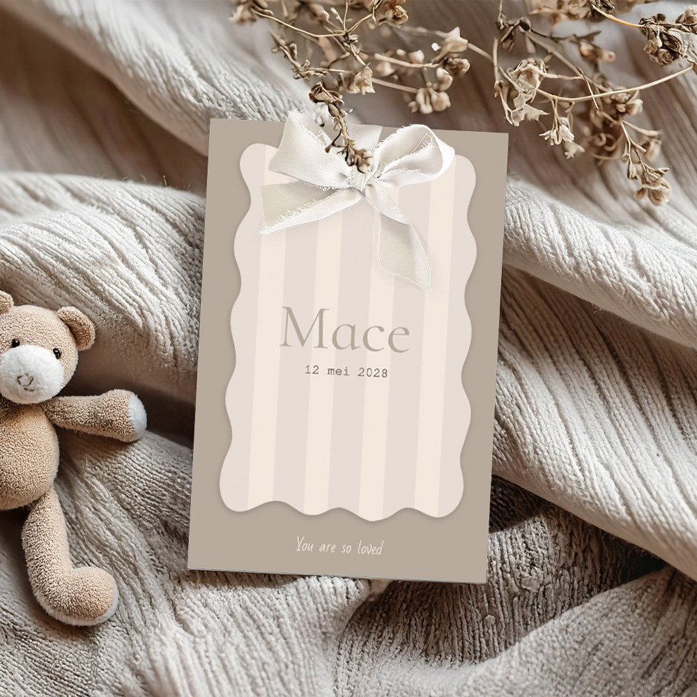Hip en trendy geboortekaartje voor een jongen of meisje. Dit unisex geboortekaartje Mace heeft neutrale kleuren maar door de strepen en het golvende label en strik heeft het kaartje een originele en luxe uitstraling.