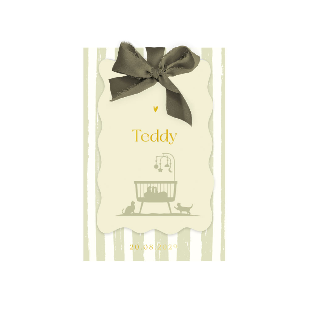 Prachtige labelkaart met zijden chiffon strik en goudfolie. Dit geboortekaartje heeft neutrale kleuren en is daardoor geschikt voor zowel een jongen als een meisje. Je ziet op dit unisex geboortekaartje Teddy een silhouet van een wieg met baby en 2 katten erbij. Extra leuk is dat je je huisdieren bij de kaart betrekt, deze zijn natuurlijk ook onderdeel van het gezin! De voorkaart heeft een golvende rand en de achterkaart een streep patroon. Bevestig de kaartjes aan elkaar door middel van de zijden strik. Het subtiele glanseffect van de folieaccenten en de verfijnde touch van het zijden lint zorgen voor een stijlvolle en exclusieve uitstraling. Bestel vandaag nog dit unieke geboortekaartje.