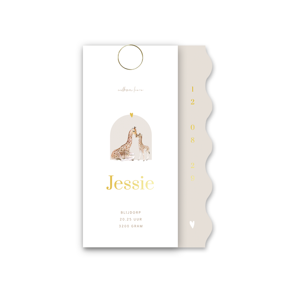 De beige kaart heeft een originele vorm, namelijk een uitsnede van golven. Dit geeft een speels effect. Op het voorste langwerpige kaartje staat de naam van jullie zoon of dochter met een illustratie van twee giraffen, een grote giraffe met veulen. De gouden foliedruk maakt dit gender neutrale geboortekaartje Jessie helemaal af. Gebaseerd op het geboortekaartje van Maeve van Joyce Verwaayen.